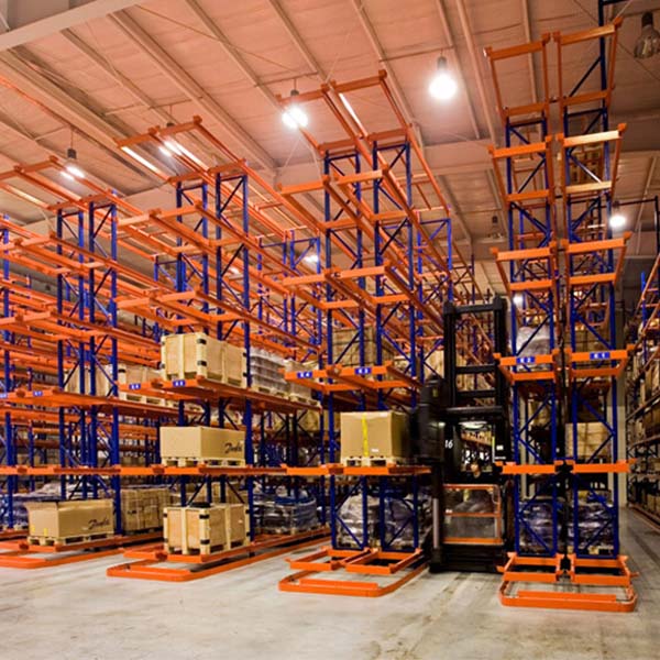 將重型橫樑式貨架的通道縮小,並配合特殊堆高機沿軌道行駛,提升倉儲密度。