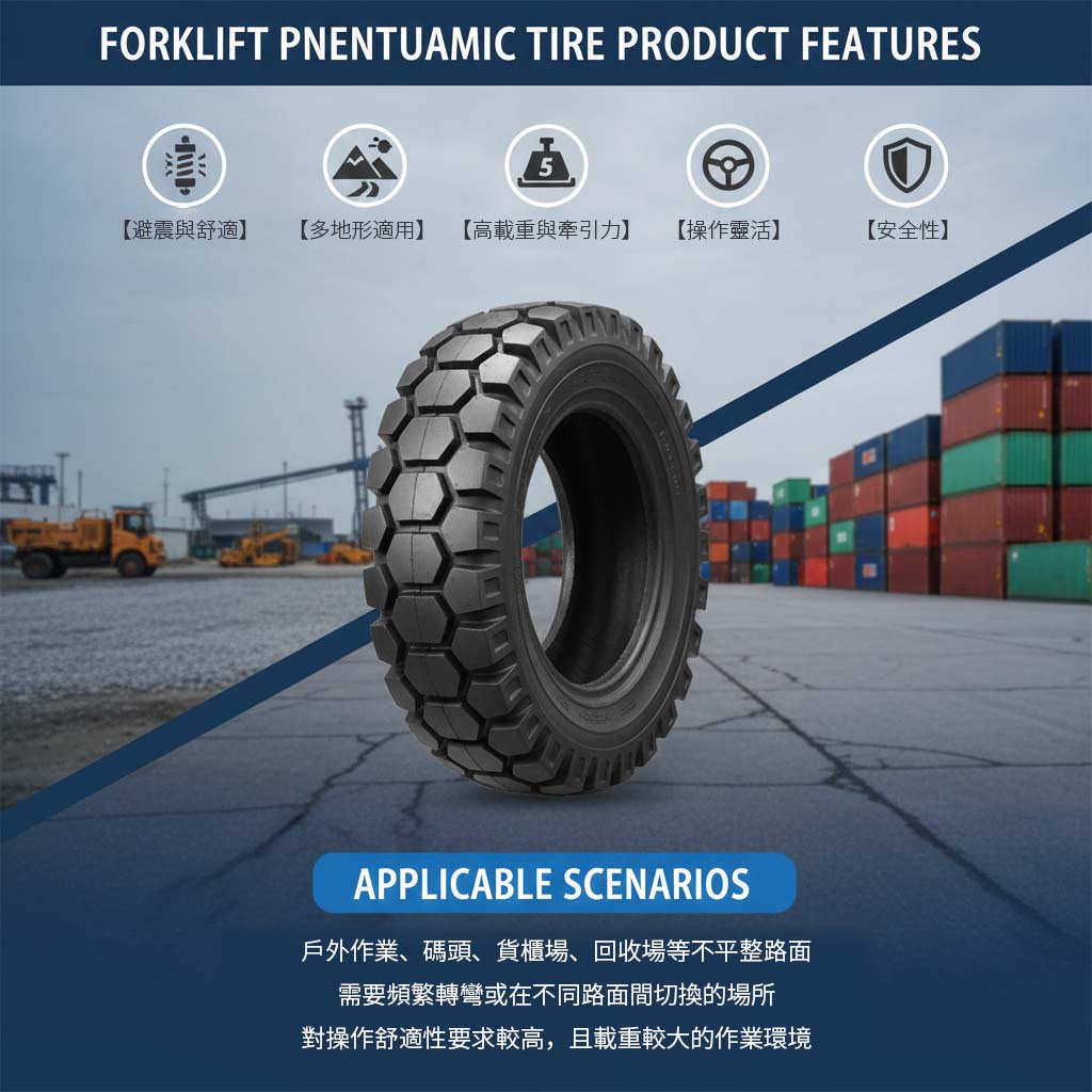 充氣胎為堆高機常見輪胎種類之一,內部以空氣支撐,具備良好的彈性與避震效果,能有效吸收地面顛簸,提升行駛舒適度。